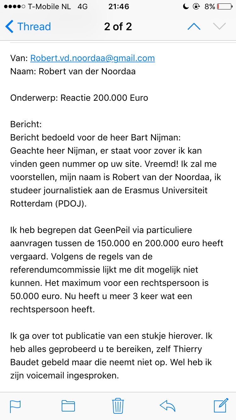open over geweest - om voor, tegen óf neutraal campagne te voeren (dus niet alleen 'tegen'). Het subsidiepotje is bedoeld om campagne te voeren. GeenPeil onderschrijft dat doel en stimuleert het: wij willen een brede opkomstcampagne voeren. Daarin vinden GeenPeil en de subsidiecommissie elkaar, blijkt nota bene uit het stuk zelf: "De commissie zegt geen bezwaar te hebben tegen de werkwijze van GeenPeil." Voilà. Beschuldiging in 1 zin ontkracht bij de bron. Wat blijft er dan over? Enkele tientallen democraten met het hart op de goeie plek die zich zijn aan zij met GeenPeil in willen zetten voor een brede opkomstcampagne, maar door een vooringenomen journalistiekstudentje van veertig worden neergezet als oplichters.
