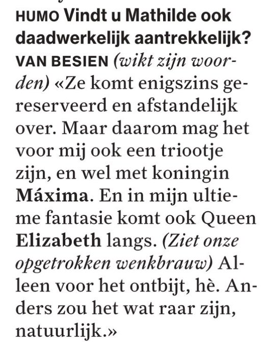 Satire is nog lang niet dood en zeker niet zolang wandelende halffabrikaten met het seksappeal van een rottende banaan op een vuilnisbelt als Groen-politicus Wouter van Besien in een interview met Belgisch kwaliteitsblad Humo toegeven dat ze het graag met die dooie van een koningin Mathilde zouden willen doen. Maar je kunt ook te ver gaan. "Ze komt enigszins gereserveerd en afstandelijk over. Maar daarom mag het voor mij ook een triootje zijn, en wel met koningin Máxima." Hoor eens Wouter van Besien. Van Onze Koninklijke Hare Majesteit de Nationale MILF Máxima blijft u af met uw vieze praatjes. Tijd voor een briefkaartenactie. Wij zijn woedend. De smiechten van Humo hebben dit opzienbarende interview ook nog eens achter de (be)taalgrens verstopt dus als u de poeplap wilt trekken voor de complete grensoverschrijdende fantasie dan kan dat via Bl€ndle. Bah bah.