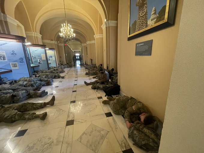 Well this is something I thought I’d never see. National Guard members getting rest in the Capitol, guns by their sides, under the busts of Lincoln and Washington.