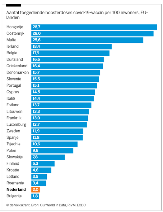 Vanaf 1 februari moet iedereen die met een vaccinatiebewijs op zijn QR-paspoort door Europa wil reizen niet langer dan negen maanden geleden zijn laatste prik gehad hebben. Zoals u aan de Nederlandse sterftecijfers kunt zien, neemt de werking van de vaccins behoorlijk af. Het oorspronkelijke plan was volgens de NOS om de nieuwe regels al in januari in te laten gaan, maar De Jonge heeft er dus nog een paar weken uitstel uit weten te slepen. In de rest van Europa heeft namelijk iedereen en zijn schele oom al een uitnodiging voor de derde prik te pakken, terwijl Nederland het weer eens 'verstandig' aanpakt en fier boven Bulgarije staat op de boosterranking. Dat wordt opschieten als we niet nog meer SCHRIJNENDE verhalen in de pers willen hebben over SLACHTOFFERS die misschien wel niet op WINTERSPORT kunnen. Prikken prikken prikken dus, voor de zorg, en voor de Europese bureaucratie.