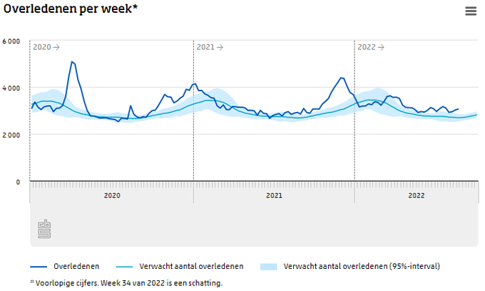 Waar je ook nooit meer iets van hoort, is oversterfte. Dat is aan de ene kant gek, want op een week in mei en een week in augustus na, is er in Nederland al sinds april de hele tijd sprake van oversterfte. Aan de andere kant is het logisch, omdat de mate van oversterfte een stuk lager is dan tijdens de coronapieken, en omdat iedereen die het woord 'oversterfte' ergens op het internet probeert te typen meteen allerlei volslagen debielen in zijn nek heeft zitten die 'vaccin!!!' of '🧐vaccin!!!' gaan roepen, terwijl de oversterfte dus niet door de vaccins wordt veroorzaakt. Ondertussen is directe sterfte door corona nu, zeker de laatste maanden, ook geen waarschijnlijke verklaring voor het hoge sterftecijfer. Je zou haast gaan vermoeden dat er iets achter zit, namelijk een complexe combinatie van factoren. Maar toch. Ze is er dus nog wel, die oversterfte. Ook al hoor je er niet zo vaak meer over.