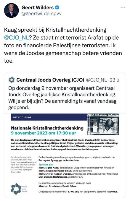 Sigrid Kaag spreekt donderdag 9 november tijdens de Nationale Kristallnachtherdenking in Amsterdam. Het Centraal Joods Overleg nodigt altijd bekende sprekers uit, vorig jaar was het bijvoorbeeld Wopke Hoekstra, eerder Vera Bergkamp, Frans Timmermans en Ferd Grapperhaus om wat namen te noemen. En nu dus demissionair minister van Financiën en voormalig D66-leidster Sigrid Kaag. Dat is PVV-leider Geert Wilders ook niet niet ontgaan dus die gooide vandaag een stuk lokaas in de X-arena over De Foto en De Aanslag.