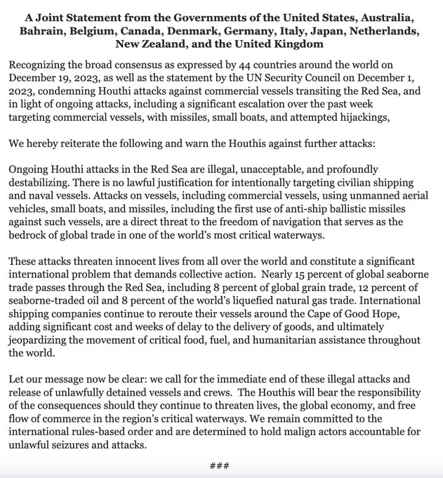 Iedereen staat op scherp in 'de regio' en dat heeft met twee dingen te maken. Ten eerste de dood van Hamas-kopstuk Saleh Al-Arouri, die door de Mossad en de IDF (nog geen officieel statement, maar 'US officials' geven volgens de WaPo aan dat Israël het gedaan heeft) naar z'n maagden is gejoekeld. Ten tweede de aanslagen op de herdenkingsdienst voor haatgeneraal Qassim Soleimani, die in 2020 uit het leven werd gehaald door Donald Trump. Hezbollah-leider Hassan Nasrallah gaf gisterenavond een speech met veel stoere praat ("als de vijand een oorlog tegen Libanon begint, dan zullen we vechten zonder grenzen, zonder beperkingen, zonder regels, zonder controles") en jodenhaat, en Iran heeft de schuld van de aanslag op de Soleimani-dienst alvast bij de VS en Israël gelegd. "'Washington says USA and Israel had no role in terrorist attack in Kerman, Iran. Really? A fox smells its own lair first', the Iranian president’s political deputy, Mohammad Jamshidi wrote on X, formerly Twitter. 'Make no mistake. The responsibility for this crime lies with the US and Zionist regimes (Israel) and terrorism is just a tool'." Het bleef echter rustig vannacht, qua vergeldingsacties. Wie zich nu wel zorgen moeten maken zijn de Houthi's, want deze Jemenitische rebellen hebben een laatste waarschuwing gekregen. Joint statement van onder meer de VS, Duitsland, het Verenigd Koninkrijk en... Nederland. HOLLAND! Later meer.